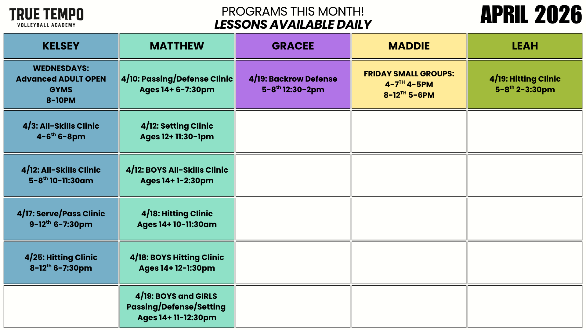 At True Tempo Volleyball Academy, we operate independently with no club or school program affiliations. This allows us to train without bias and focus solely on athlete development through high-quality reps and proven training methods.